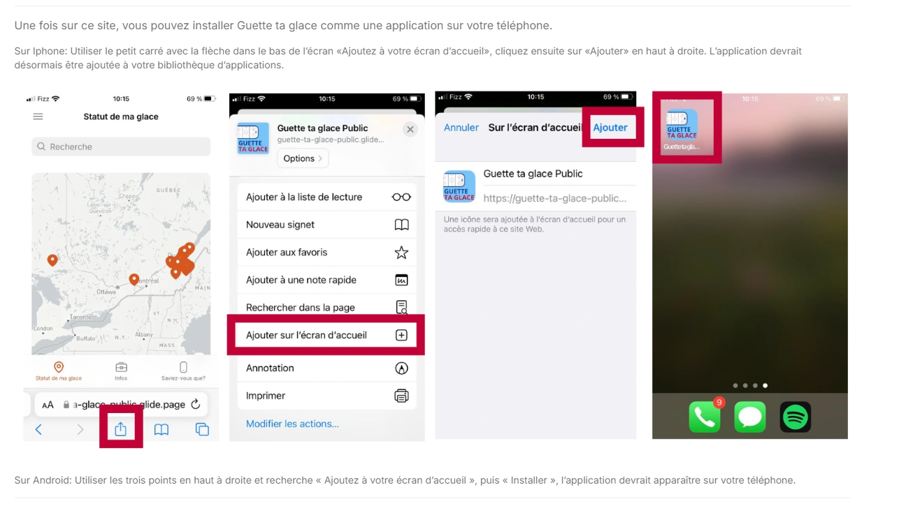 Consultez en temps réel l’état de la glace grâce au projet Guette ta glace du Conseil régional de l’environnement Chaudière-Appalaches (CRECA) sur votre navigateur : https://guette-ta-glace-public.glide.page