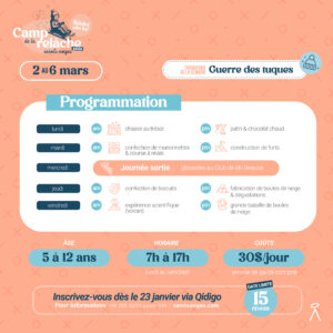 La programmation comprend des activités amusantes, variées et éducatives qui permettront à vos enfants de découvrir la cuisine, de laisser aller leur imagination en bricolant, de faire travailler leur logique lors d’une chasse au trésor et de lâcher leur fou à l’extérieur en s’amusant dans la neige. Le clou de la semaine? Une journée de glissades au Club ski Beauce! Bref, la semaine hivernale PAR-FAITE!