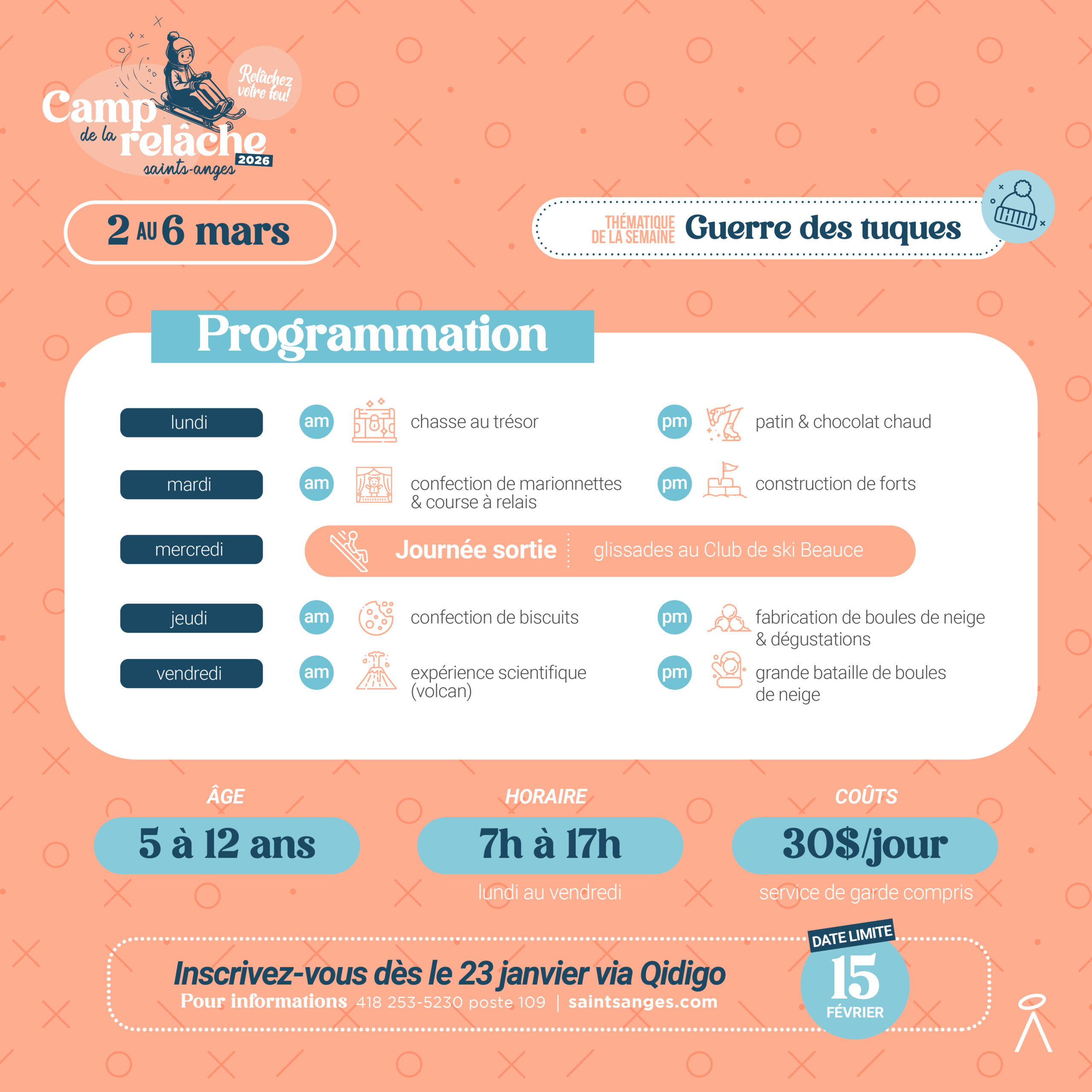 Les inscriptions auront lieu du 23 janvier au 15 février sur la plateforme Qidigo de la municipalité de Saints-Anges. C’est juste ici!